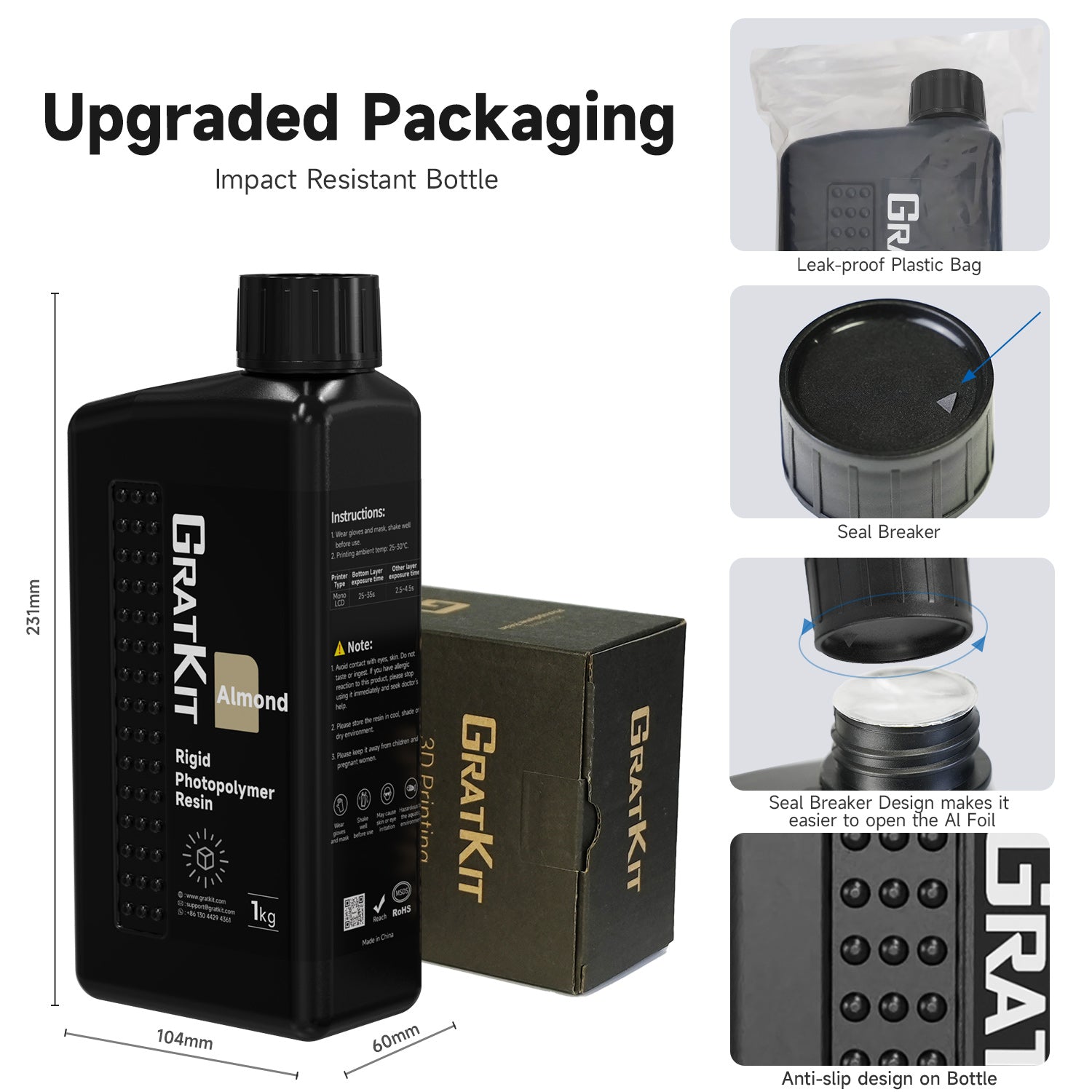 【Upgraded Protection Bottle】GratKit Ultra HD Rigid Photopolymer Resin is packed in bottles with an anti-slip design. An aluminium foil wafer is used to seal the bottle so the resin can be kept in good condition. GratKit has also built a needle on the bottle cap to help cut open the Al-foil easily.