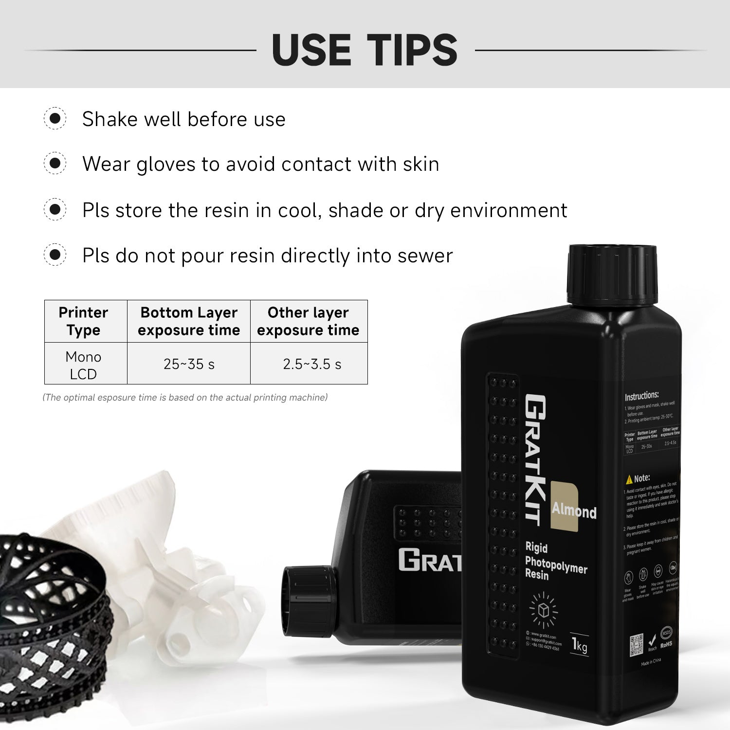 GratKit Basic 3D printer tough resin is compatible with mainstream resin 3D printers with wavelength 405nm SLA and DLP. Compatible brands cover GratKit, Anycubic, Creality, ELEGOO, NOVA, to list just a few.